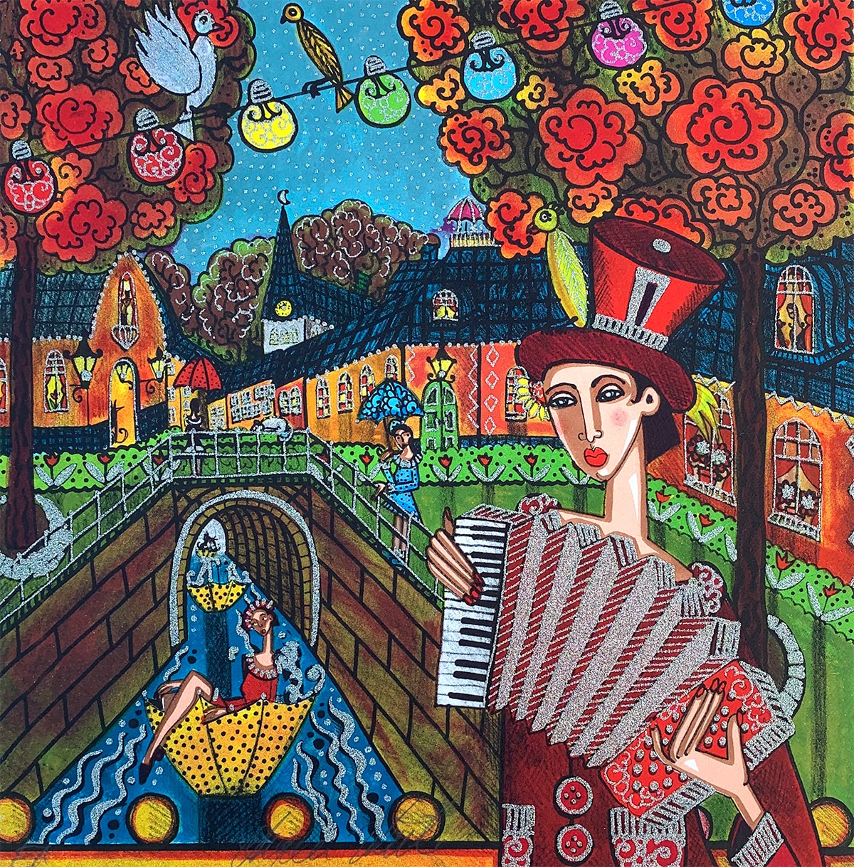 Angelica Wiik är en nutida svensk konstnär som älskas av sin publik för sina färgexplosiva och expressiva målningar. Det är uttalad feminism och kärlek till människor, stadslandskap och djur som får hennes tavlor att lyfta och hon är inte blyg när det gäller färgsättning eller val av motiv. Hennes bilder är som sköna drömmar med musiker på taken och hundar i fönstren. Det är bilder som förför den betraktare som vill bli förförd. Det är bilder man blir glad av att betrakta.